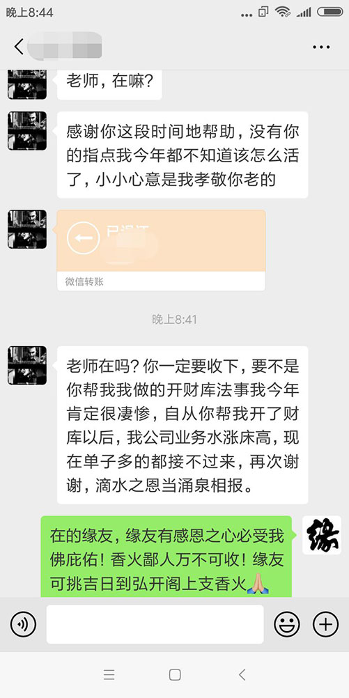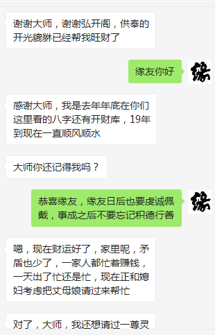 案例三:开财库 改善财运,改善婚姻问题! 山东的杨女士 自身是做生意的,客户的欠款一直收不回,自己投资股票更是一败涂地,亏了上百万。夫妻感情也不好,结缘弘开居士 V:H454414调理改善后,前来反馈,已是明显改善!V:H454414